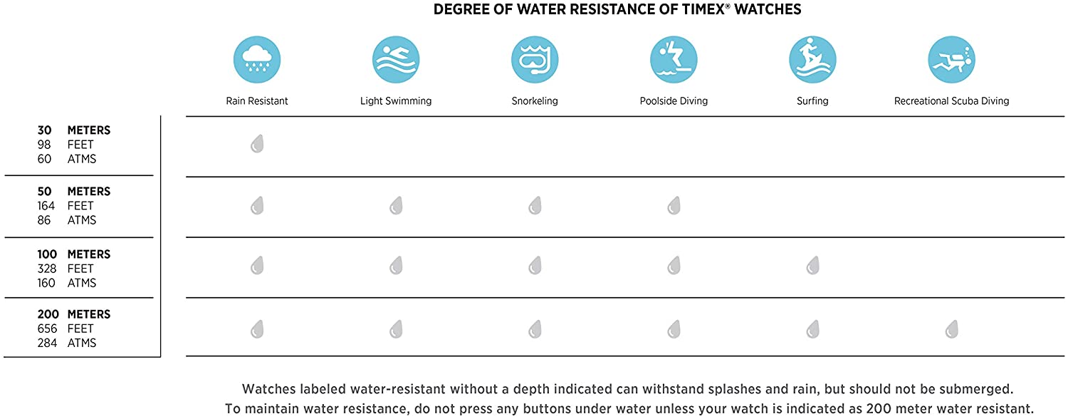 - Water resistant to 30m (100ft): in general, withstands splashes or brief immersion in water, but not suitable for swimming or bathing