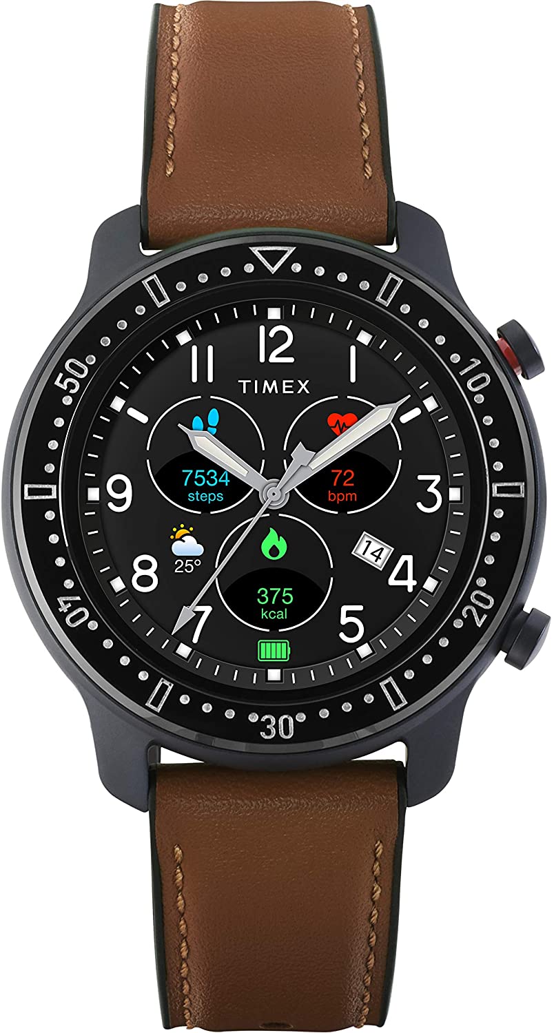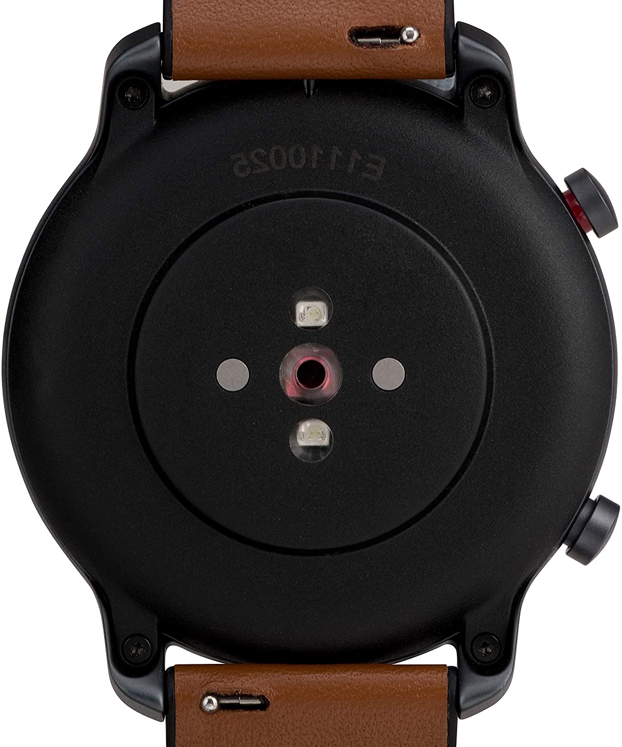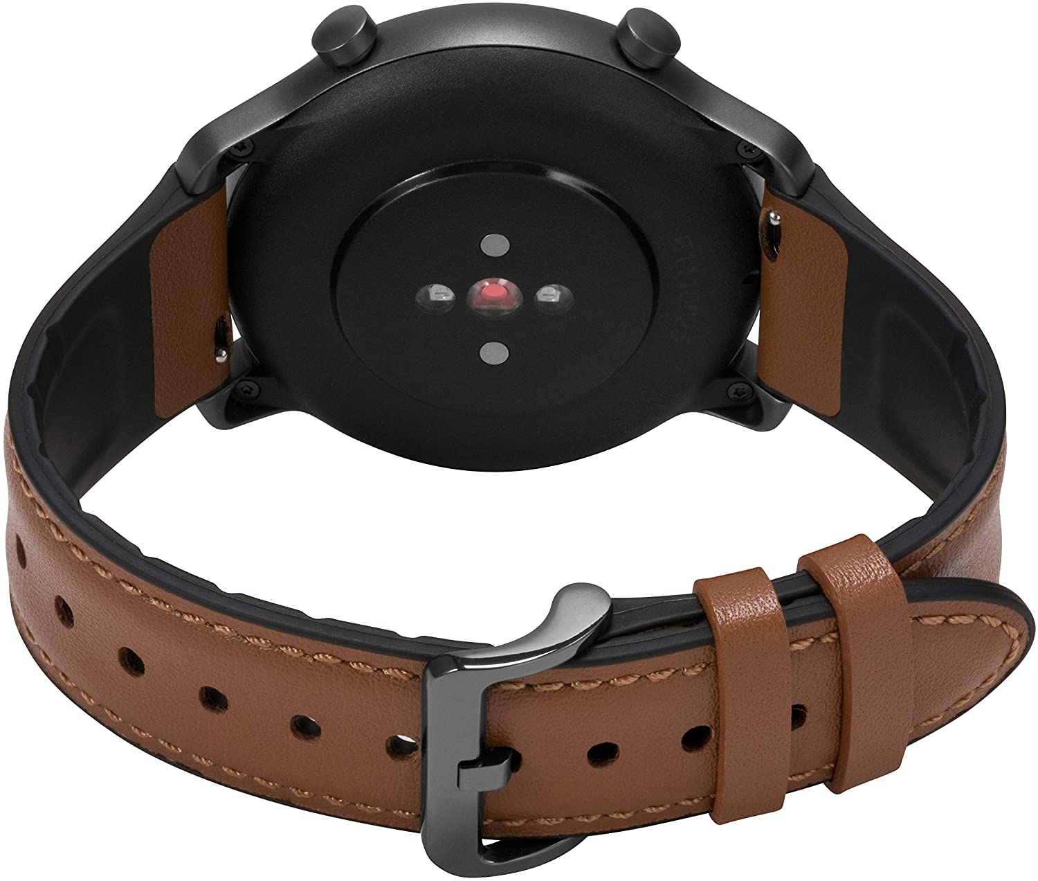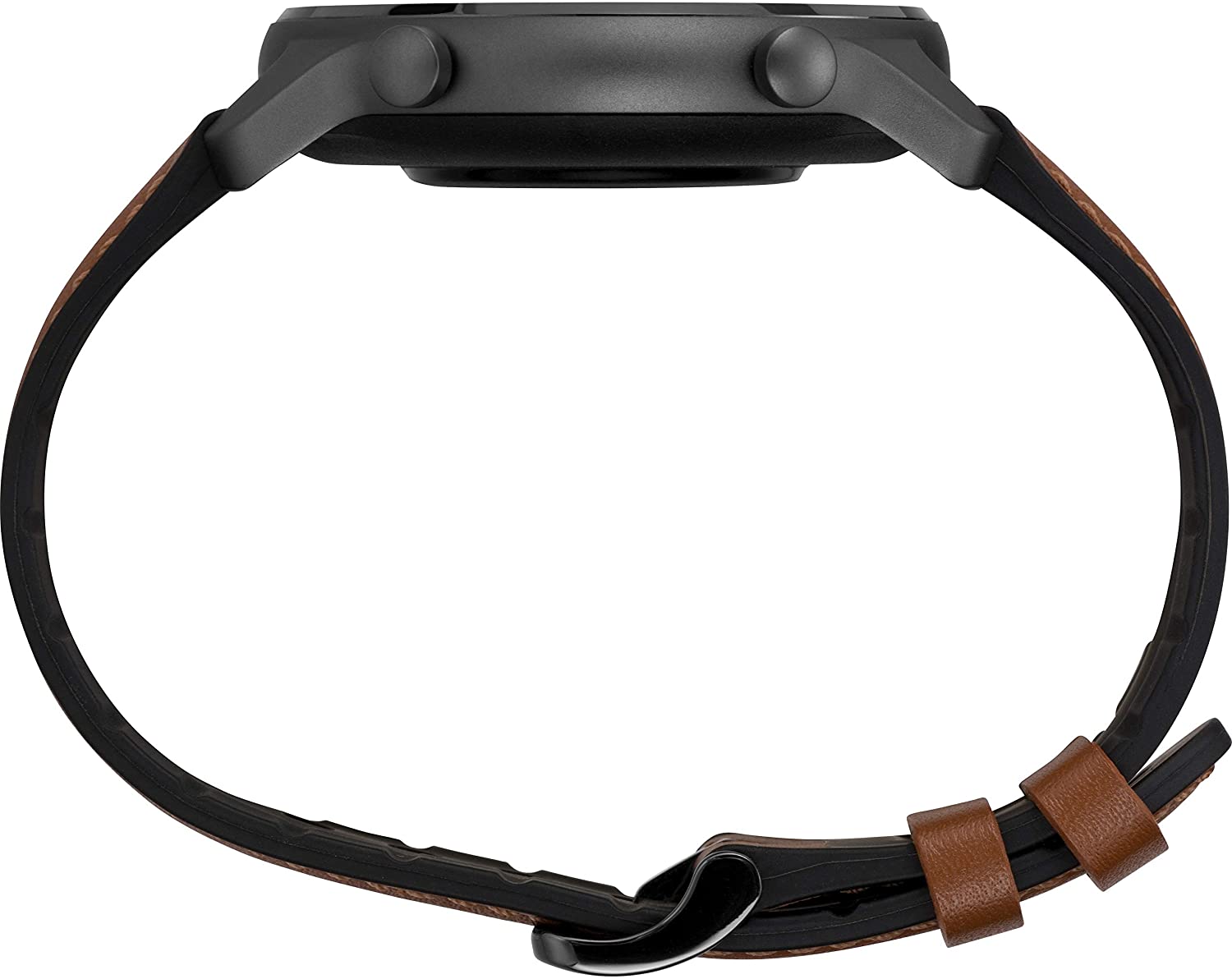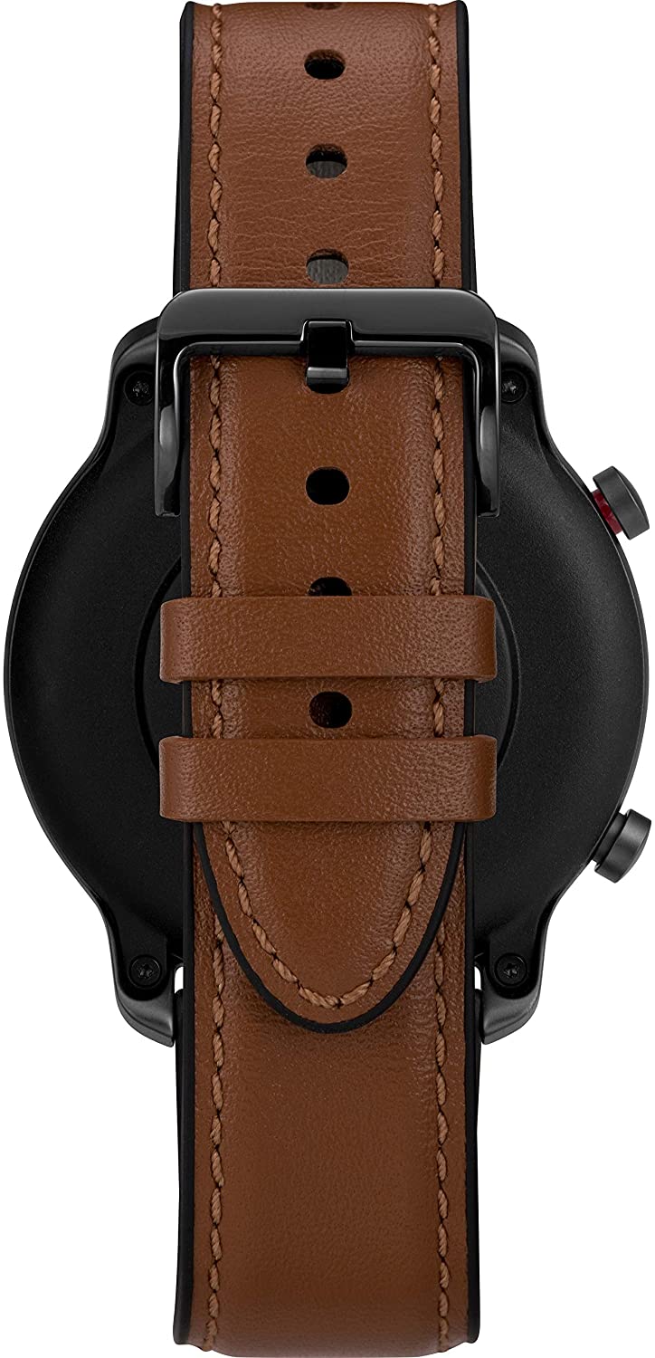Metropolitan R has all the functionality you need including up to 2 weeks of battery life. This sleek design boasts an impressive AMOLED display that you can customize with over 20+ dial designs. Plus, 24/7 activity and sleep tracking for your health and fitness goals, on-board GPS, optical heart rate sensor, notifications and much more. This is the perfect smartwatch to fit your busy lifestyle. The brown leather and silicone combination strap is complemented by a black metal case and scratch-resistant Gorilla Glass lens.